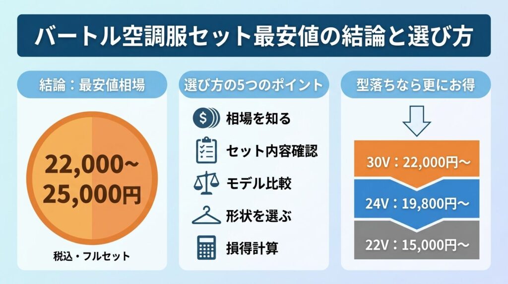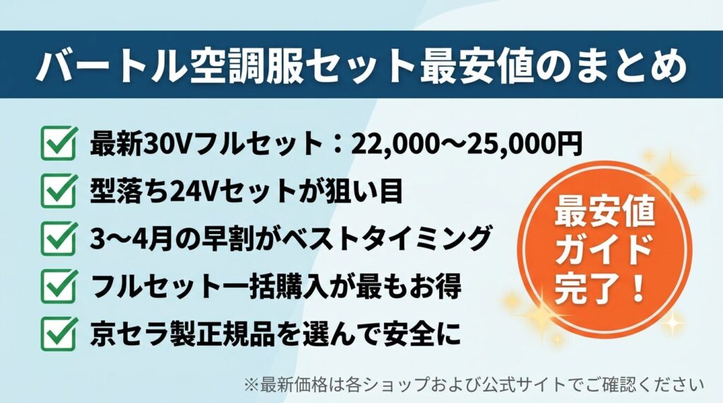 ここまでの内容を整理すると、バートル空調服セットを最安値で手に入れるためのポイントは以下の通りです。