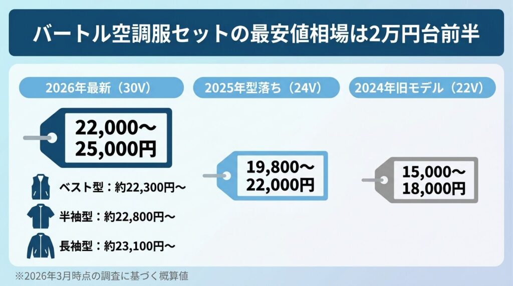 結論から言うと、2026年の最新モデル(AC10バッテリー+AC10-1/AC10-2ファン+ウェア)のフルセット実売価格は、税込22,000〜25,000円が相場です。型落ちの2025年モデル(AC09・24V)セットなら税込19,800〜22,000円、さらに2024年モデル(AC08・22V)なら15,000円前後まで下がるケースもあります。