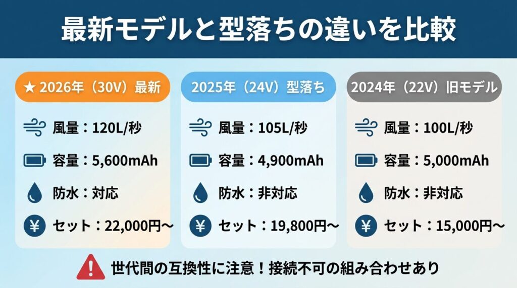 特におすすめなのはAC09(2025年・24V)の型落ちセットです。最大風量105L/秒は十分な性能で、最新30Vモデルとの体感差は「少し風が弱いかな」程度です。価格差が2,000〜5,000円あることを考えると、コストパフォーマンスは非常に高いと言えます。