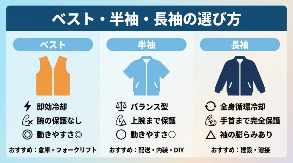 → 空調服は長袖・半袖・ベストどれがいい?選び方と涼しさを徹底比較