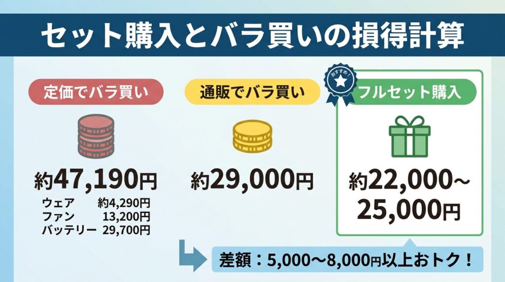 「フルセットで買うのとバラバラで買うの、どっちが安いの?」という疑問は非常に多いです。結論から言うと、フルセット購入のほうが5,000〜8,000円以上お得になるケースがほとんどです。以下の比較を見てください。