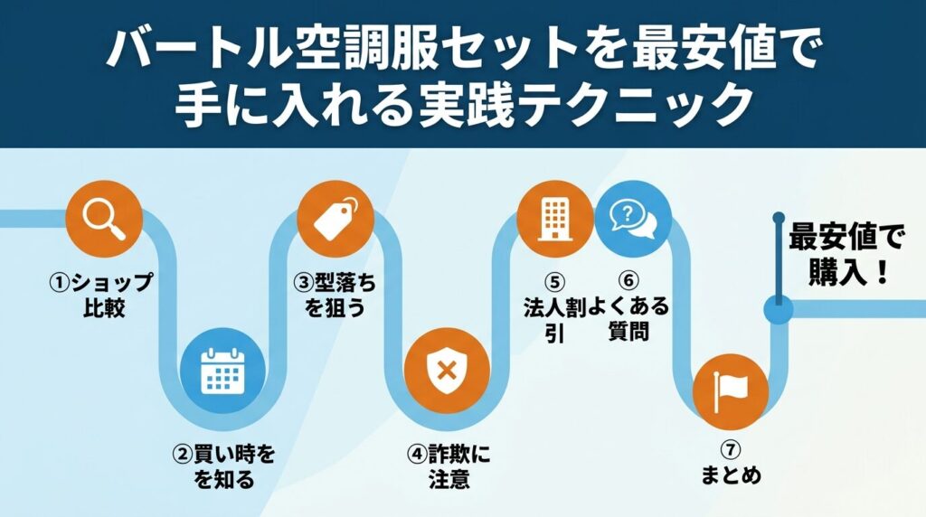 ここからは、実際にバートル空調服セットを最安値で購入するための具体的なテクニックを紹介していきます。ショップの価格比較から買い時のタイミング、型落ちの狙い方、そして安すぎるセットに騙されないための注意点まで、実践で使える情報をまとめました。
