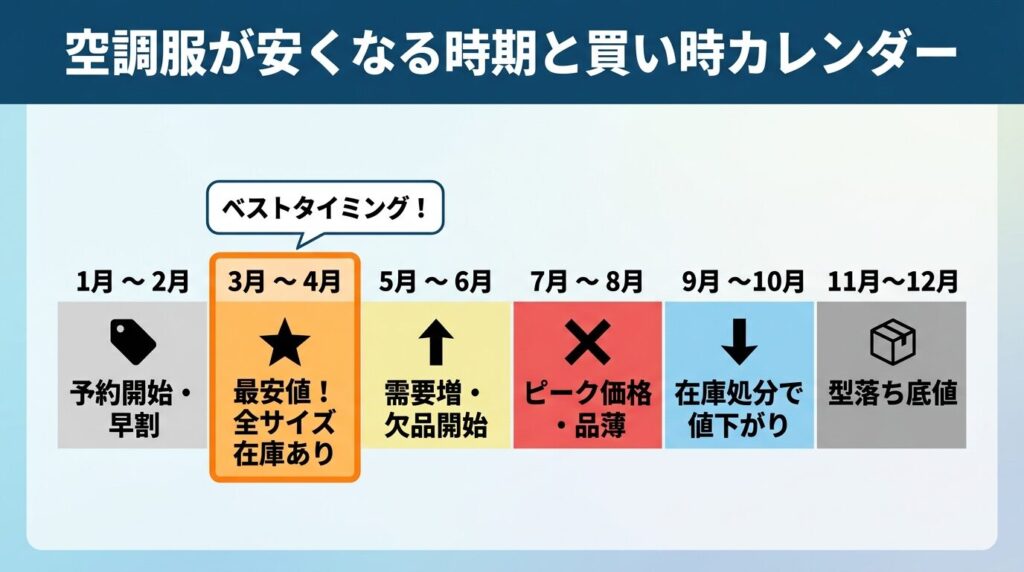 バートル空調服セットには「安く買える時期」と「高くても買えない時期」がはっきり存在します。結論から言うと、最もお得に購入できるのは3〜4月です。