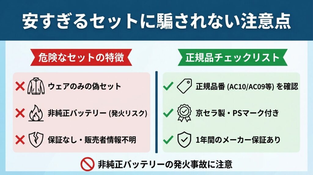 バートルの空調服セットを安く買いたい気持ちはよく分かりますが、安すぎるセットには要注意です。ネット通販では残念ながらトラブル事例が後を絶ちません。以下のチェックポイントを購入前に必ず確認してください。