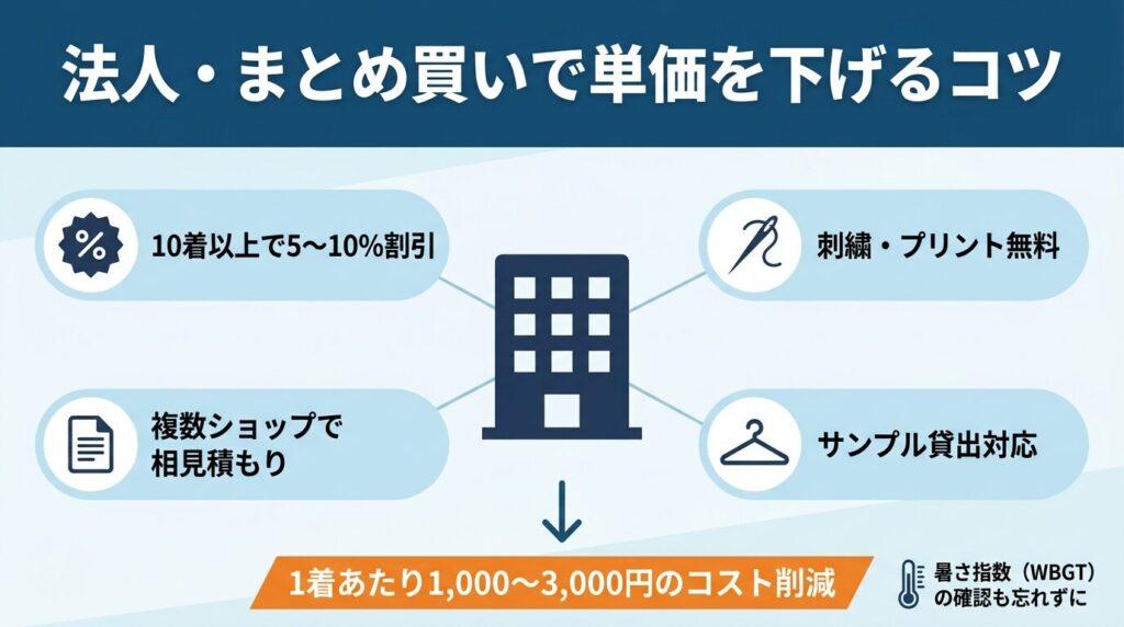 法人でのまとめ買いを検討する際のポイントは、見積もり依頼を複数のショップに出して条件を比較すること、サンプル貸出で実際のサイズ感を従業員に試着させること、刺繍やプリントなどの加工オプションの有無を確認すること、そして納期に余裕を持って発注すること(特に5月以降は混み合います)の4点です。10人以上の導入であれば、個人購入と比べて1着あたり1,000〜3,000円程度安くなることが多いので、総額で考えるとかなりの差になりますよ。