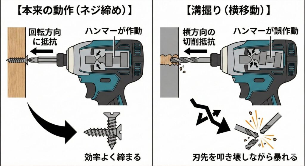 溝を掘ろうとしてビットを横に動かすと、その抵抗を「締め付けが必要な負荷」と勘違いしてインパクト機構が作動してしまいます。その瞬間、刃先には回転方向への強烈なショックが加わります。