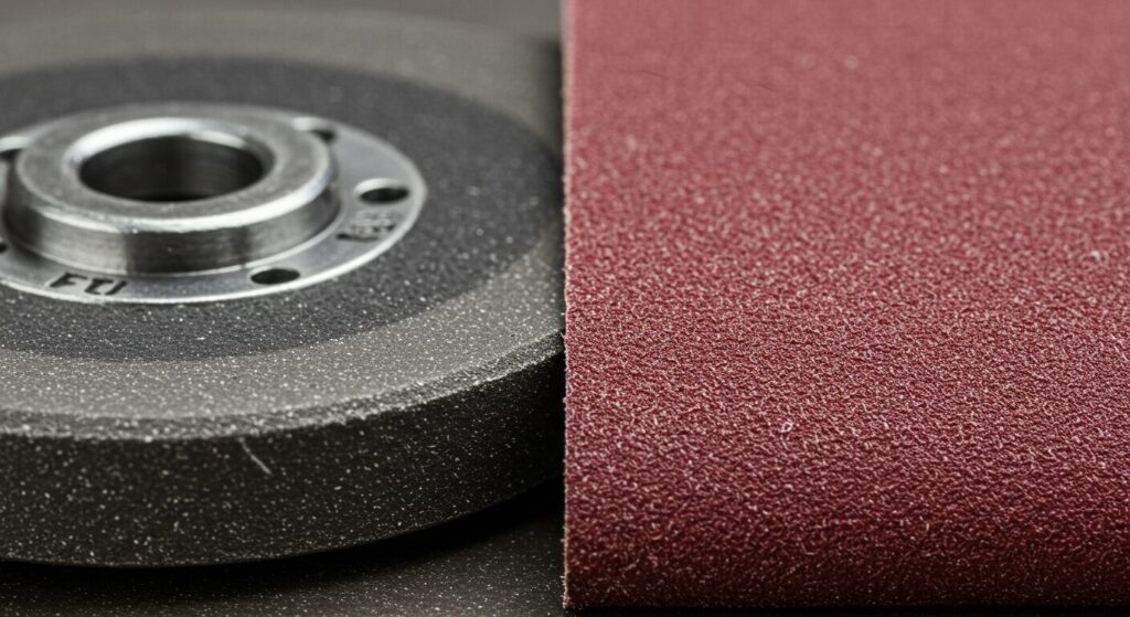 グラインダーとサンダー、この二つの工具の最も根源的で決定的な違いは、材料を直接加工する先端パーツ、すなわち「先端工具」の物理的特性にあります。グラインダーが極めて硬質な研削材の粒子を結合剤で固めた「砥石(といし)」を使用するのに対し、サンダーは布や紙の柔軟な基材に研磨粒子を付着させた「サンドペーパー」を使用します。この先端工具の特性の違いが、それぞれの工具が持つパワー、主目的、そして得意な作業内容を完全に別のものへと決定づけているのです。