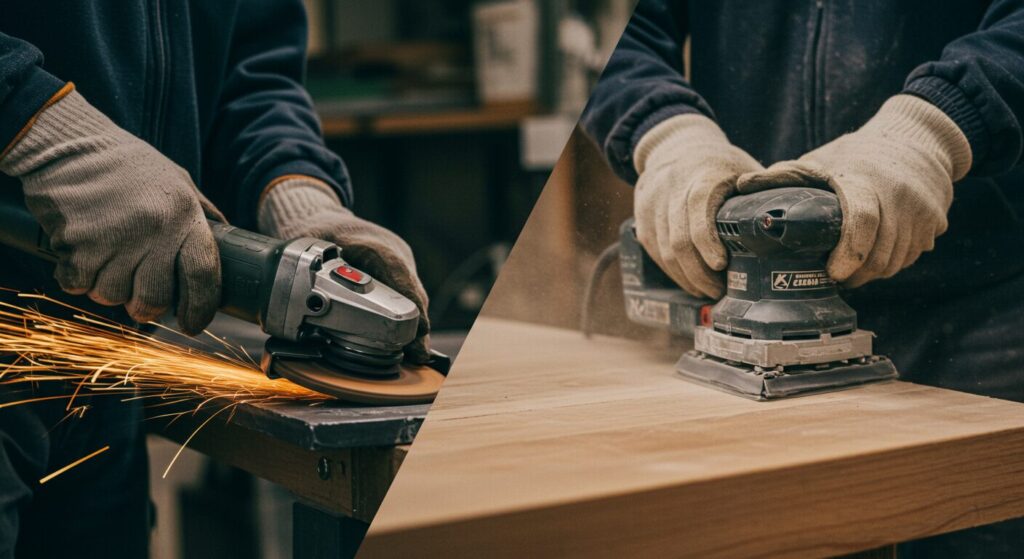 ご覧の通り、両者は「削る」という言葉で一括りにされがちですが、その目的と対象は全く異なります。この違いを理解せずに工具を選ぶことは、例えば繊細な木製テーブルの天板を滑らかにしたい場合に、誤って強力なディスクグラインダーを使用してしまい、その強すぎるパワーで木材を修復不可能なほど深くえぐってしまうような、致命的な失敗につながる可能性があるのです。