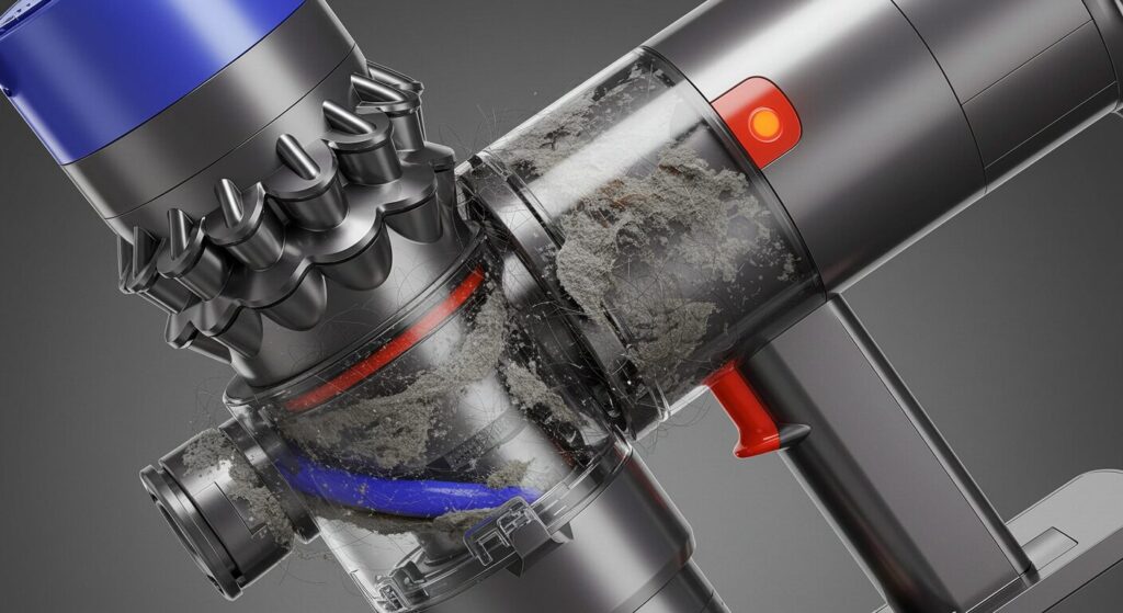 2. パイプ・クリアビン:パイプ(杖)を取り外し、内部にティッシュやおもちゃの部品などが詰まっていないか、光に透かして確認しましょう。クリアビン(ダストカップ)のゴミを捨て、内部の吸い込み口周辺にゴミが固着していないかもチェックします。