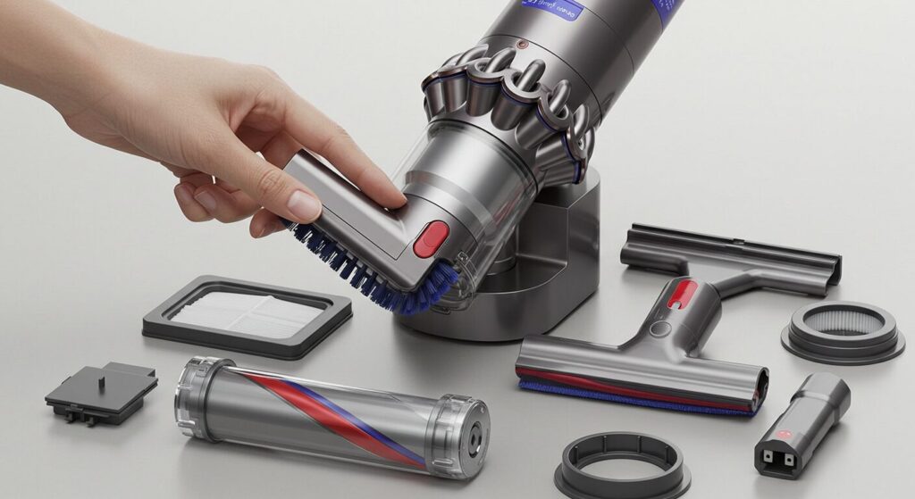 3. クリーナーヘッド:ダイソンの強力なヘッドは、髪の毛やペットの毛、糸くずなどが回転ブラシに絡まりやすい部分です。多くのモデルではコインや専用の留め具でブラシを簡単に取り外せますので、定期的に絡まったゴミを除去してください。ブラシの回転が妨げられると、モーターへの著しい負荷となります。