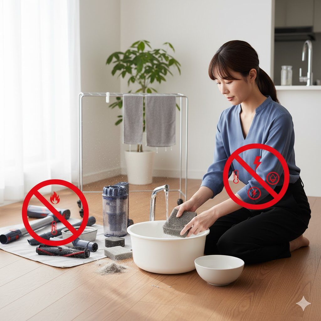 特に重要なフィルターやダストカップの洗い方、そして何より「乾燥時間」を間違えてしまうと、せっかくお手入れしたのに逆にカビや雑菌が繁殖して、悪臭の原因になってしまうことも…。