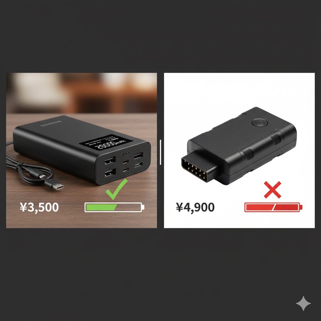 一方で、世の中には10,000mAhや20,000mAhといった大容量のモバイルバッテリーが、純正バッテリーと同等か、それ以下の価格でゴロゴロ売られています。