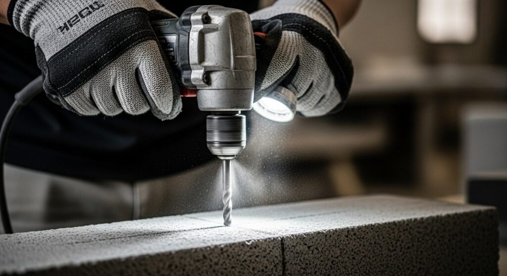 インパクトのような打撃がないため、ブロックを割ってしまうリスクが少ないからです。ただし、やはり「コンクリート用ビット」は必須ですし、時間はかかります。
