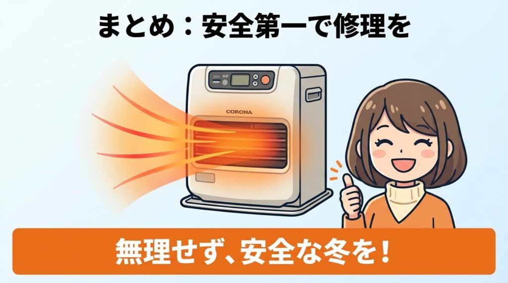 ここまで読んで「自分には難しそうだな」「分解してみたけど、内部がサビだらけで限界かも」と感じた方は、無理に修理を続行せず買い替えを検討しましょう。暖房器具は安全が第一です。