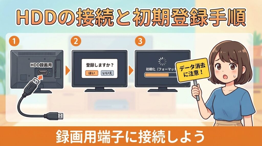 HDDを用意したら、テレビに接続して使えるようにしましょう。この時、「初期化(フォーマット)」という作業が必ず必要になります。
