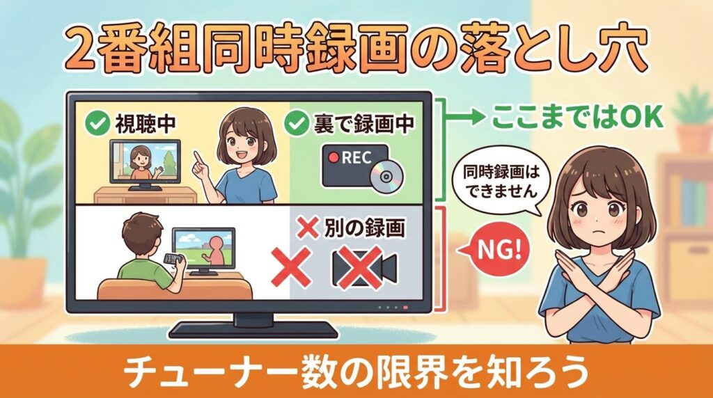 「HDDを繋いだから、レコーダーみたいにジャンジャン録画できるぞ!」と思っている方は、少し注意が必要です。テレビの録画機能には、内蔵されている「チューナー数」による限界があります。