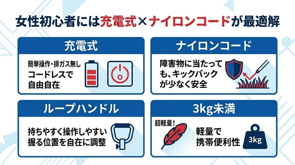 - 女性初心者には充電式×ナイロンコードが最適解