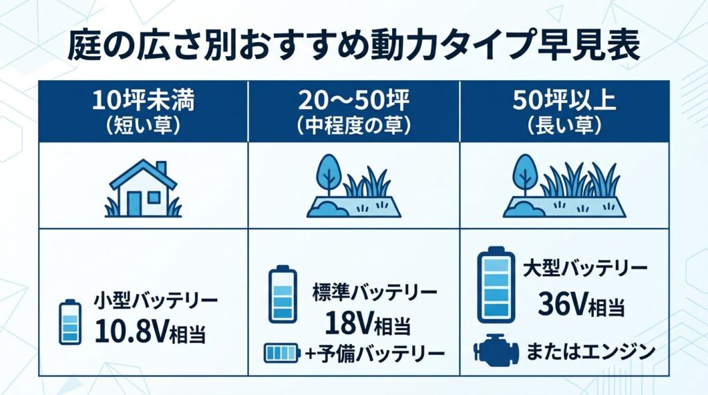 - 庭の広さ別おすすめ動力タイプ早見表