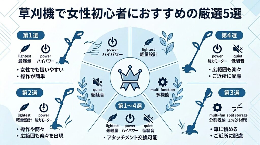 ここからは、これまで解説してきた「軽さ・安全性・使いやすさ」の条件を満たした、女性や初心者でも扱いやすいおすすめの草刈機を5つ厳選してご紹介します。まずは比較表でそれぞれの特徴やスペックを見比べて、ご自身の環境に合いそうなものを探してみてくださいね。