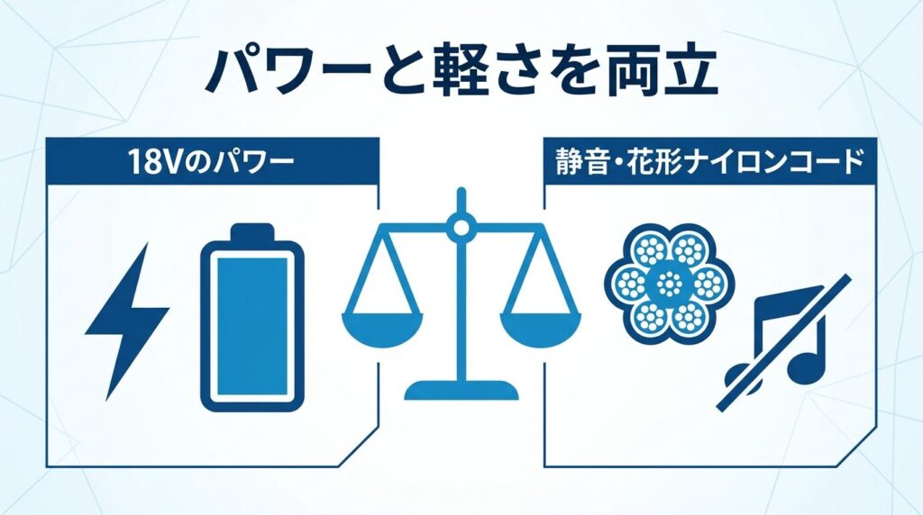 最大のメリットは、やはり1.8kgという圧倒的な本体の軽さと、スイングバック機能による高い安全性です。実際の女性ユーザーの口コミでも「掃除機をかけるような感覚で軽くて使いやすい」「これなら私一人でも準備して使える」と大変好評を得ています。