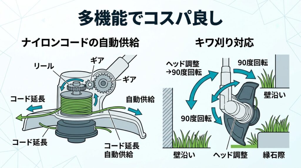 さらに素晴らしいのが、カッターヘッドの角度をボタン一つで90度回転させることができる機能です。これにより、フェンスの際や植え込みの下、庭石の縁など、普通の草刈機では刃が入り込みにくく苦労する「キワ刈り」も、本体を傾けることなくスイスイと快適にこなせます。メインスイッチや補助ハンドルも手袋をしたままでもしっかり握りやすいよう大型化されており、使う人の動作をよく考えて作られた、人間工学に基づく親切な設計が随所に光る一台です。