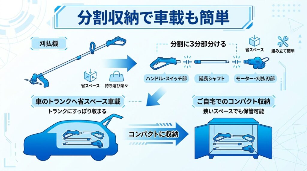 「自宅だけでなく、離れた実家の草刈りにも車で持って行きたい」「マンションのベランダや物置など、とにかく収納スペースが少ない」と保管や運搬にお悩みの方にぴったりなのが、株式会社高儀の「2WAYグラストリマー(GGT-180LiB)」です。この商品が他の草刈機と大きく違うすごいところは、長い本体のシャフト部分を工具なしで3つに分割してコンパクトに収納できる点です。軽自動車のトランクや後部座席にもすっぽりと無理なく収まるため、持ち運びの際のストレスが全くありません。