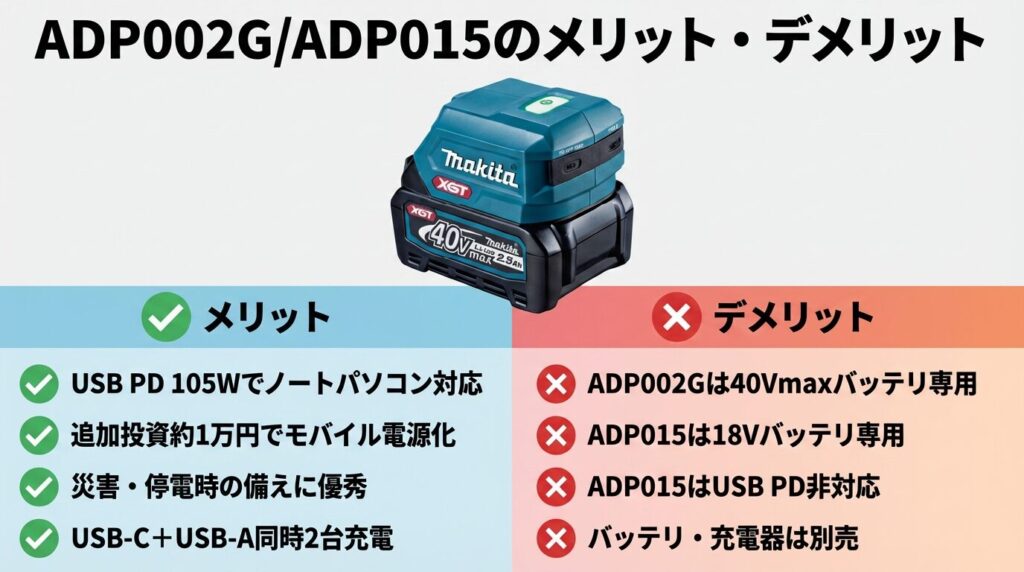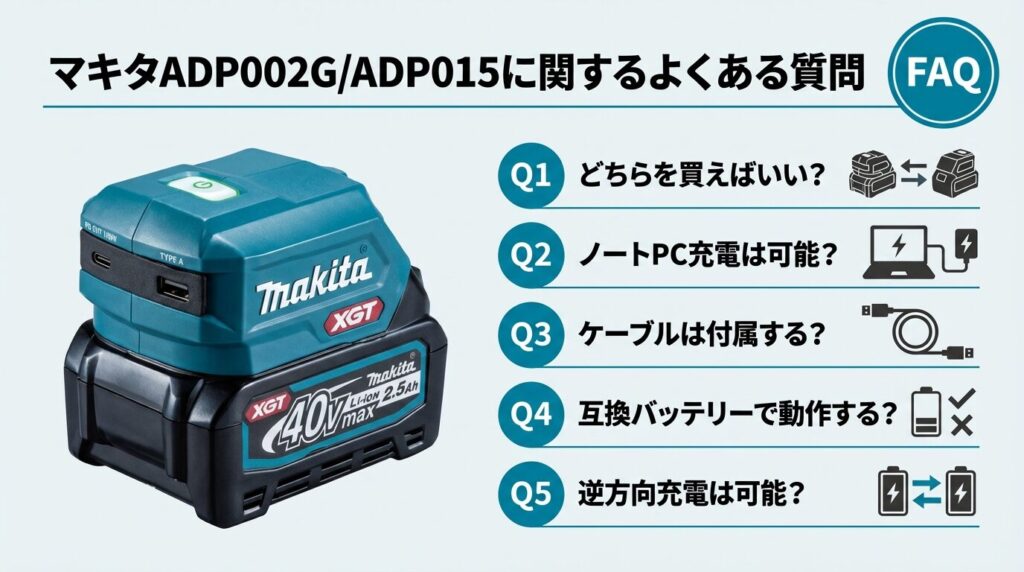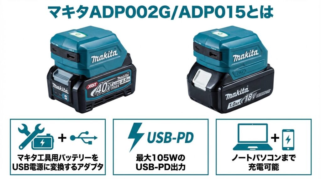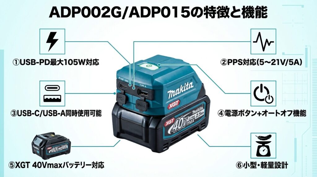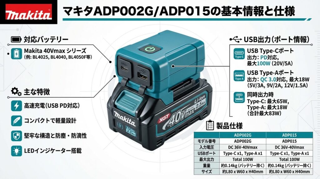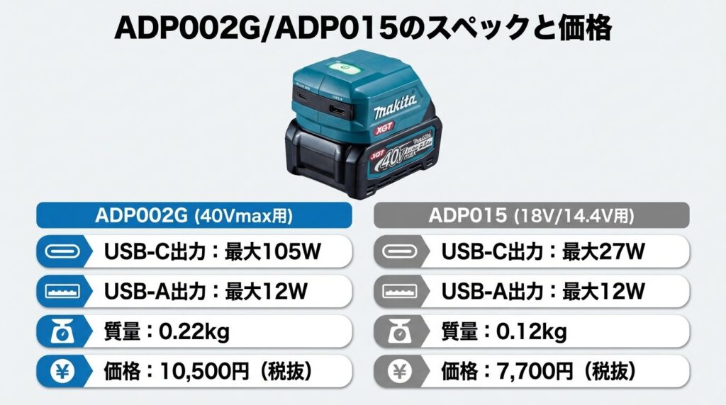 - ADP002G(40Vmax用)・ADP15(18V/14.4V用)は、どちらもUSB-C PD 105W+USB-A 12Wの同一スペック。選ぶ基準は手持ちバッテリーの電圧のみ