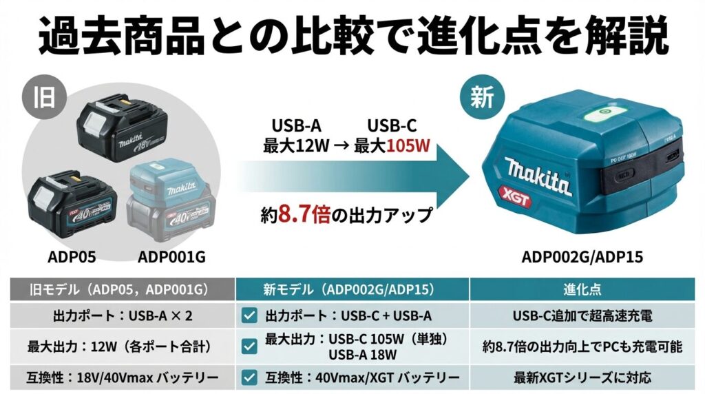 - 旧モデル(ADP05/ADP001G)やHiKOKI UC18DAとの違い