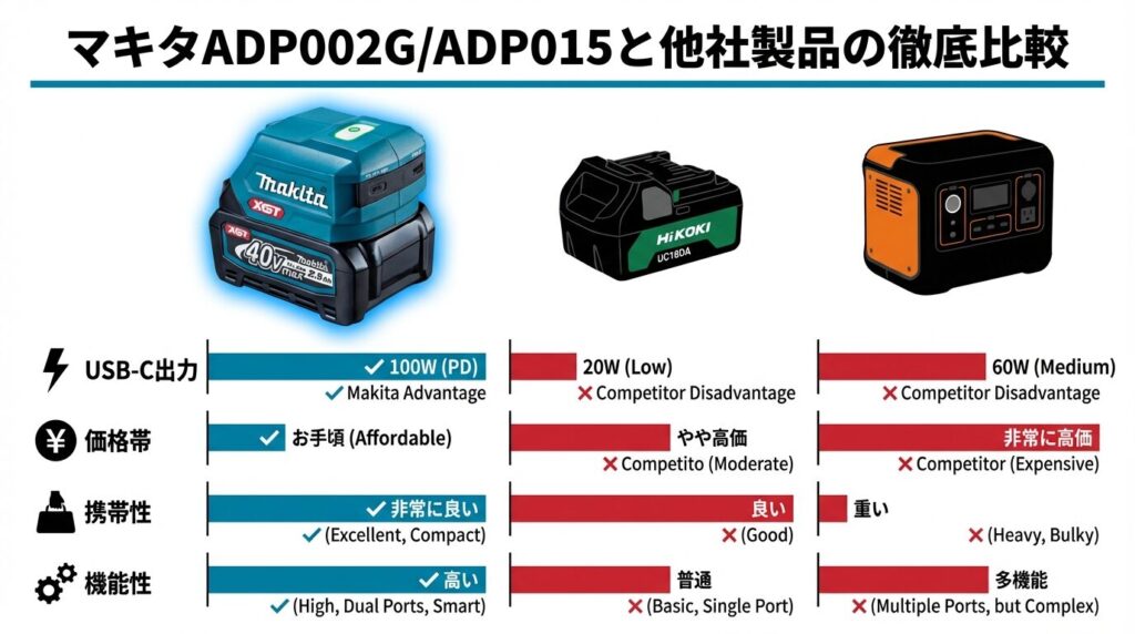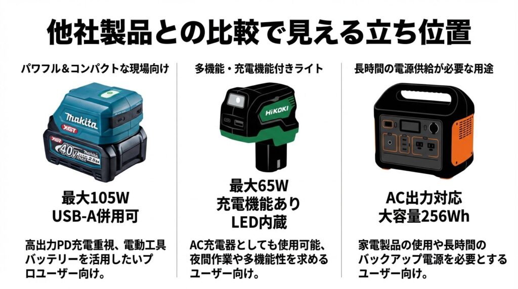 「マキタの新型USBアダプタは買いだとして、他に選択肢はないの?」と気になっている方も多いはず。実は2026年現在、USB-C PD対応の電動工具メーカー製USBアダプタは、マキタ ADP15・ADP002Gと、HiKOKI UC18DAの3機種だけなんです。ここでは比較対象になりやすい製品を紹介しつつ、ADP002G/ADP15の立ち位置を明確にしていきます。