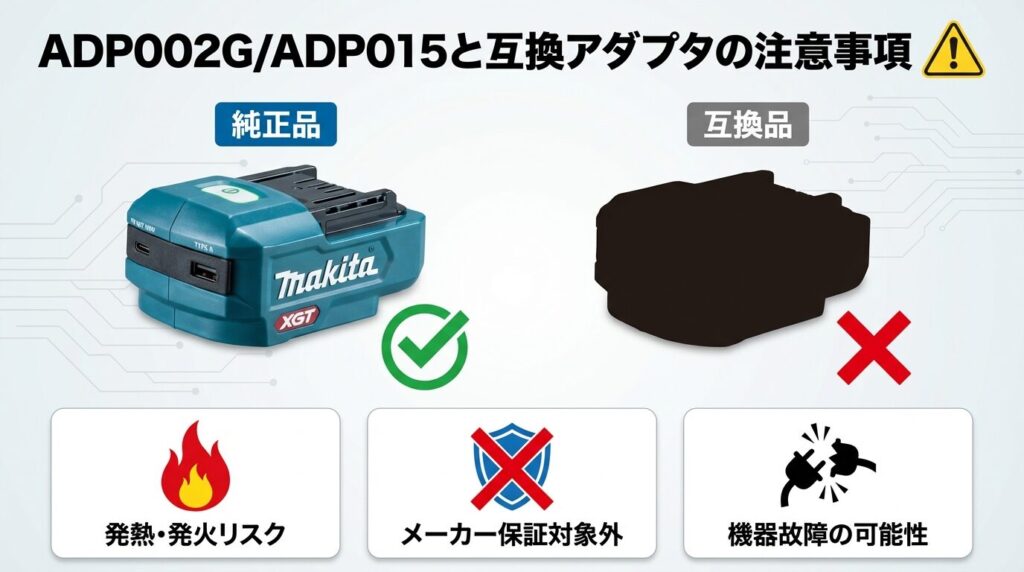 互換バッテリーは動作保証外です。ADP002G/ADP15は純正バッテリー前提の設計になっており、マキタ公式販売店も「※互換バッテリーは充電しないでください」と明記しています。互換バッテリー使用時は、発火・故障・保護回路の不適合・マキタ保証対象外といったリスクが伴います。製品評価技術基盤機構(NITE)も「非純正バッテリーは制御機能が正常に働かず事故に至るおそれがあり、購入する際はバッテリーの販売事業者に安全性について確認を行ってください」と明確に注意喚起しており、(出典:製品評価技術基盤機構『急増!非純正リチウムイオンバッテリーの事故』)のとおり、電動工具用非純正バッテリーパックを充電中に異常発熱・発火し、足にやけどを負った事例も報告されています。マキタ純正バッテリー(BL1860B、BL4025、BL4080F等)の使用が強く推奨されます。価格面で互換バッテリーが魅力に見えるかもしれませんが、長期的な安全性とアフターサービスを考えると、純正を選んでおくのが無難かなと思います。