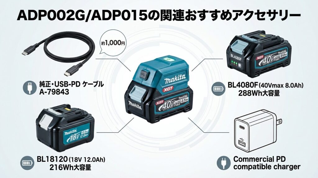 105W出力を使うなら、純正A-79843か5A/100W対応の市販品が必要。大容量バッテリー(BL4080F/BL18120)と組み合わせると本格モバイル電源化できます。100均ケーブルは発熱・安全リスクがあるため、ADP002G/ADP015との組み合わせは避けましょう。
