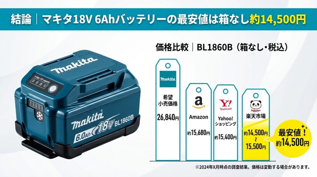 - 結論|マキタ18V 6Ahバッテリーの最安値は箱なし約14,500円