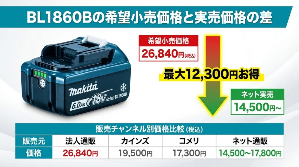 BL1860Bのメーカー希望小売価格は税別24,400円、税込で26,840円です。これはマキタ公式サイトの製品ページにも明記されている正規価格です。これに対して、各販売チャネルの実売価格はこのようになっています。