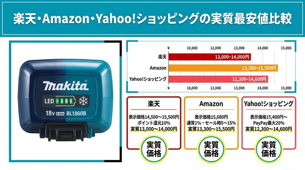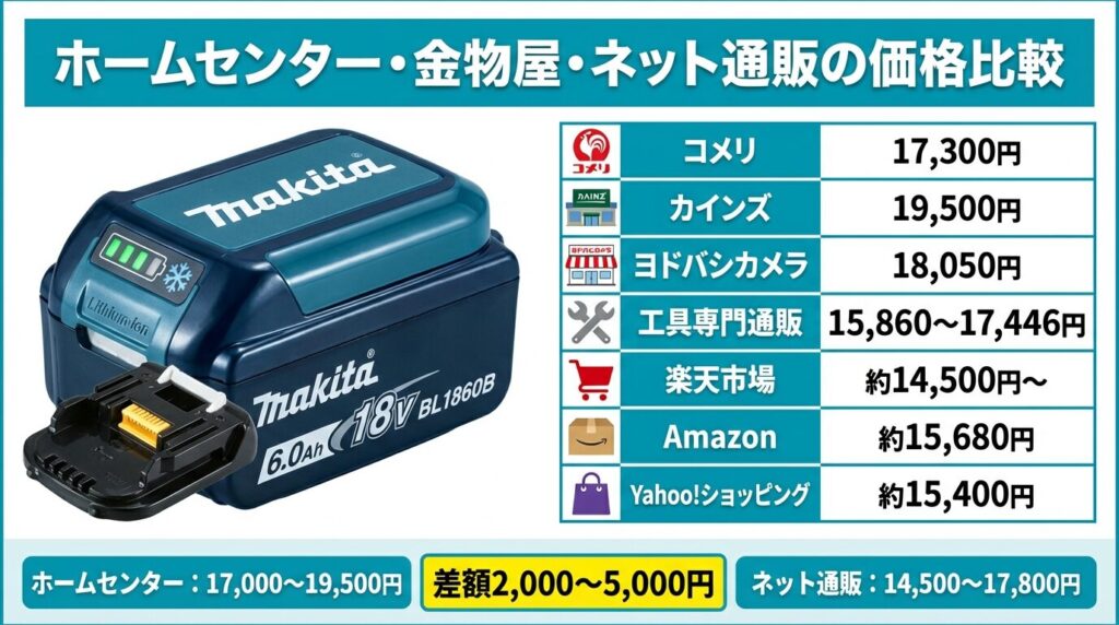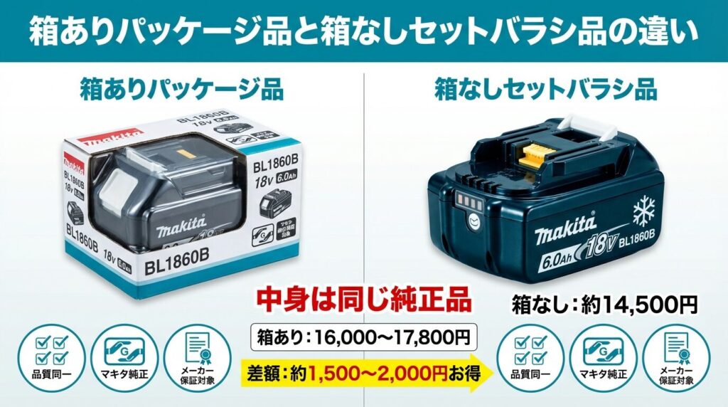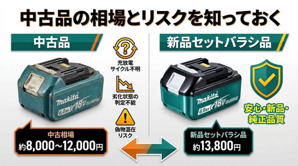- 必ず純正品を選ぶ ── 互換品は長期コストで逆に高くつき、発火リスクもある。純正BL1860Bの箱なし約14,500円が実質的な最安値ライン
