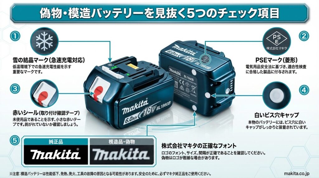 (出典:マキタ公式『「模造・非純正」バッテリにご注意』)