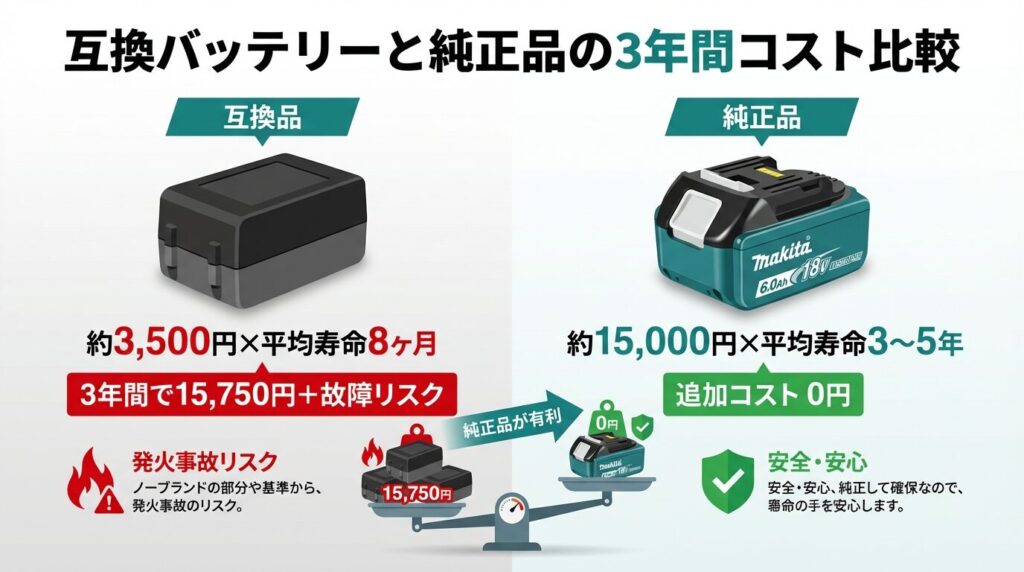 互換バッテリーは初期費用が安い反面、短寿命による買い替えコスト、容量詐称(表記6.0Ahだが実際は3.0Ah以下というケース)、発火・火災リスクなど、表面上の価格には見えないコストとリスクが存在します。特に充電中の無人環境での使用は非常に危険です。安全面を含めたトータルで判断すると、純正品BL1860Bを1本購入するほうが経済的にも安全面でも合理的です。