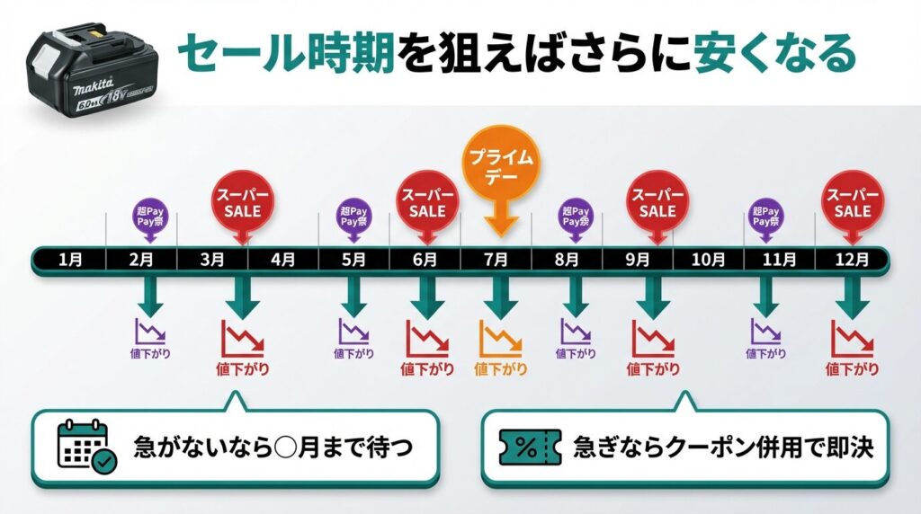 バッテリーは「必要な時が買い時」でもありますよね。現場仕事で急にバッテリーがダメになった、なんていうときに7月まで待つわけにはいきません。急ぎの場合は、毎月1〜3回開催される楽天のお買い物マラソンが最も手軽にポイント還元の恩恵を受けられるタイミングです。