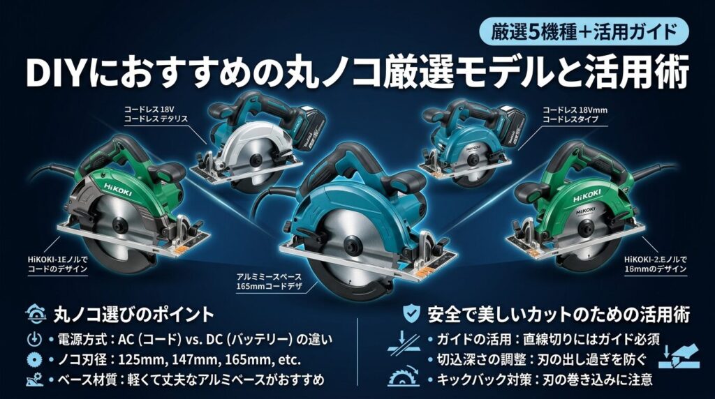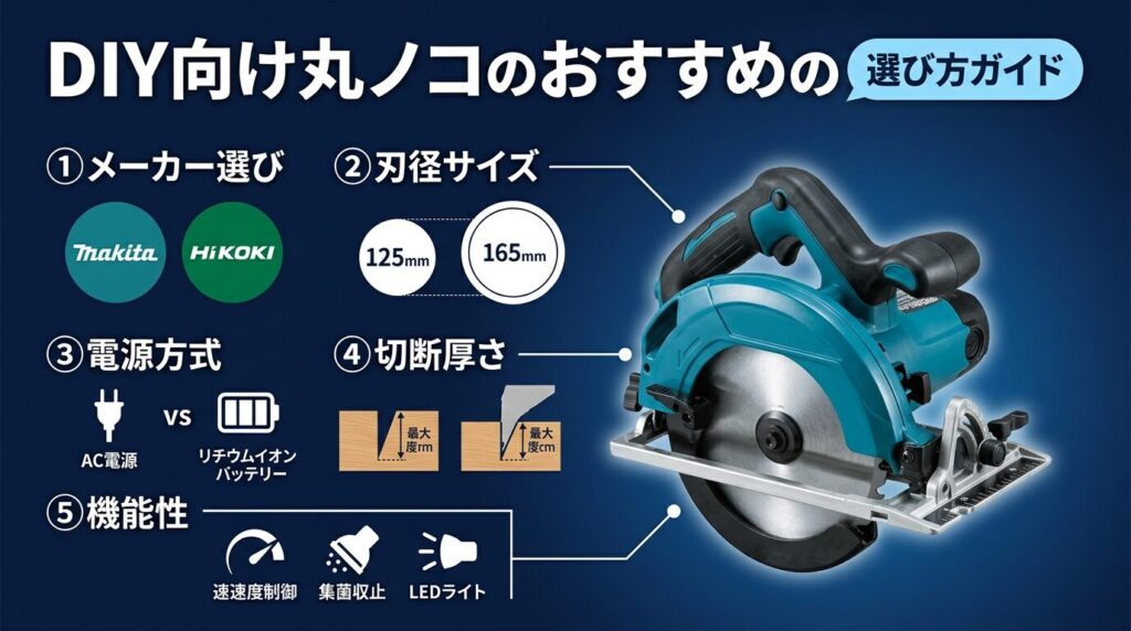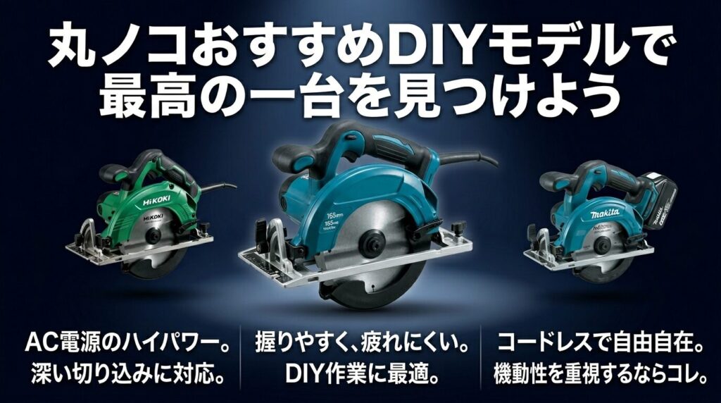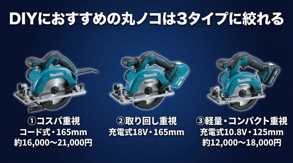 • DIY用丸ノコは「コード式165mm(コスパ重視)」「充電式18V 165mm(取り回し重視)」「充電式125mm(軽量・女性向け)」の3タイプに絞れる
