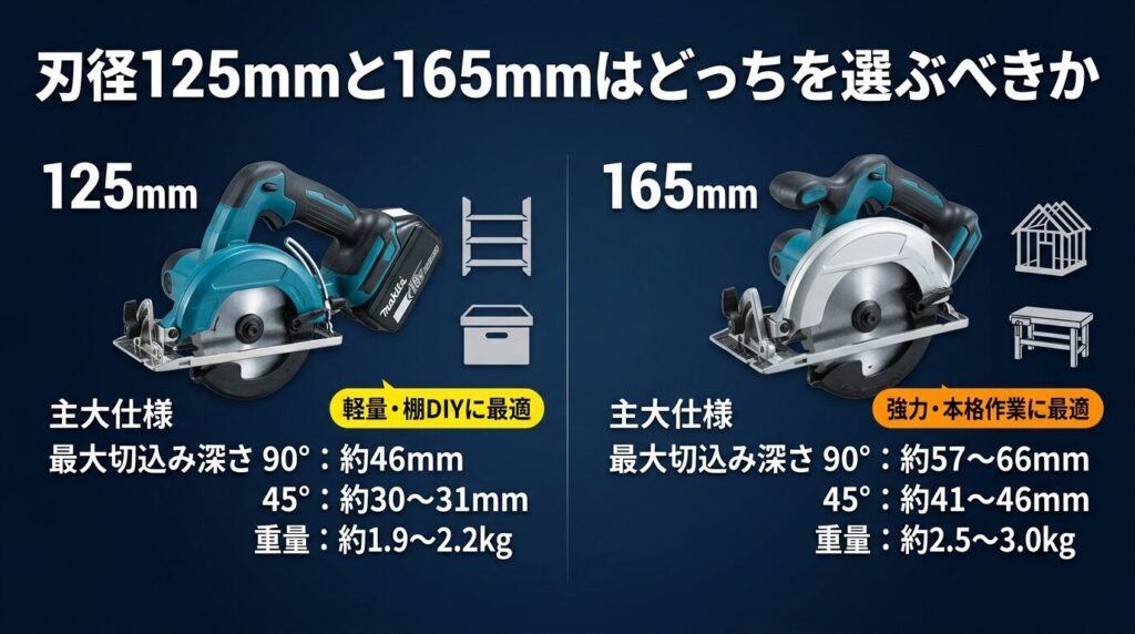 「125mmと165mm、数字は違うけど実際どう違うの?」と思いますよね。結論から言うと、最大の違いは「切り込める深さ」と「重さ」です。これが作れるものの幅に直結するので、しっかり押さえておきましょう。