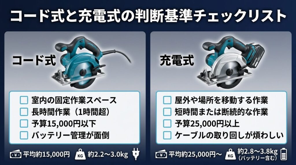 「コード式と充電式、どっちが自分に合っているかわからない」という悩みは、丸ノコ選びで最もよく出てくる質問のひとつです。価格差だけで判断してしまうと後悔しがちなので、以下のチェックリストで一度しっかり判断してみましょう。