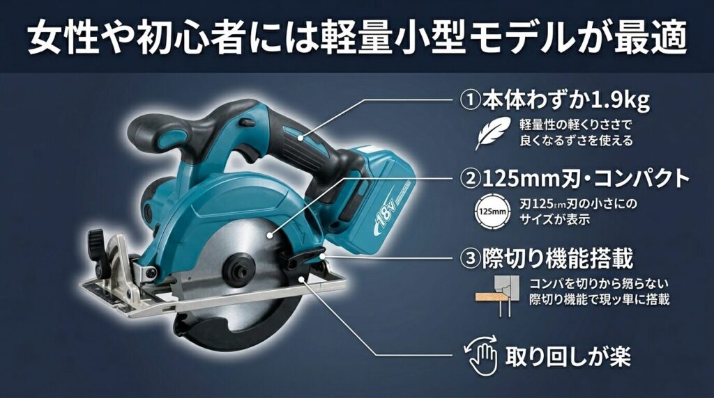 女性や体力に不安がある方には、125mm刃・約1.9〜2.1kgの軽量充電式モデルが特におすすめです。