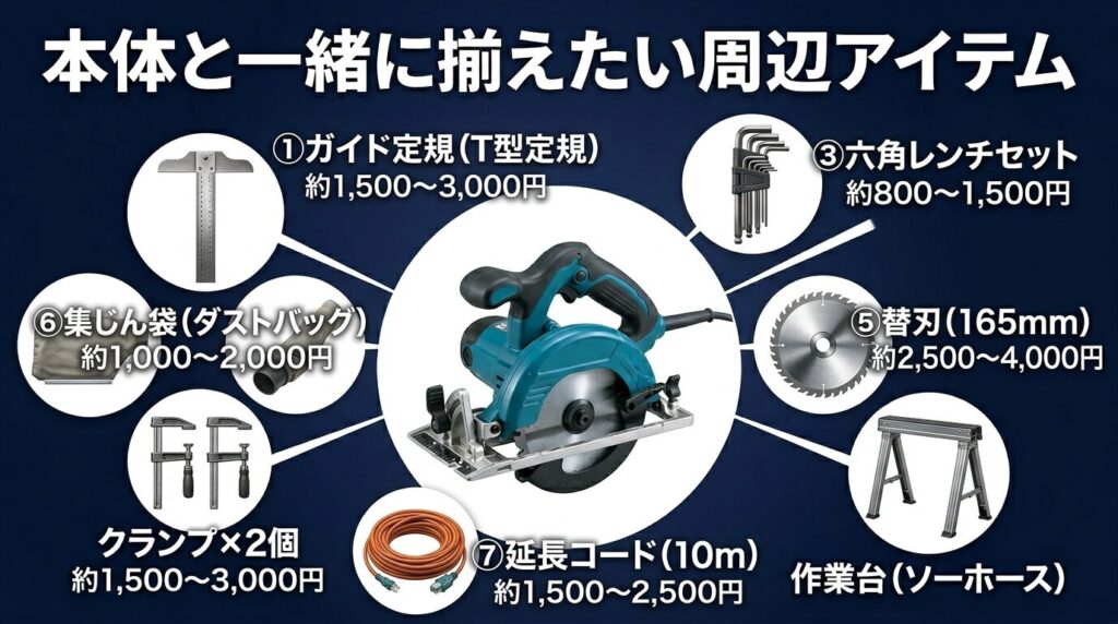 本体だけでなく周辺アイテムとチップソー選びまでセットで考えることが大切です。ガイド定規・クランプ・保護具を揃えれば、安全に・正確に・楽しく使えるようになります。合計約29,000円が「作業開始できる最低ライン」として覚えておくと予算計画が立てやすいですよ。