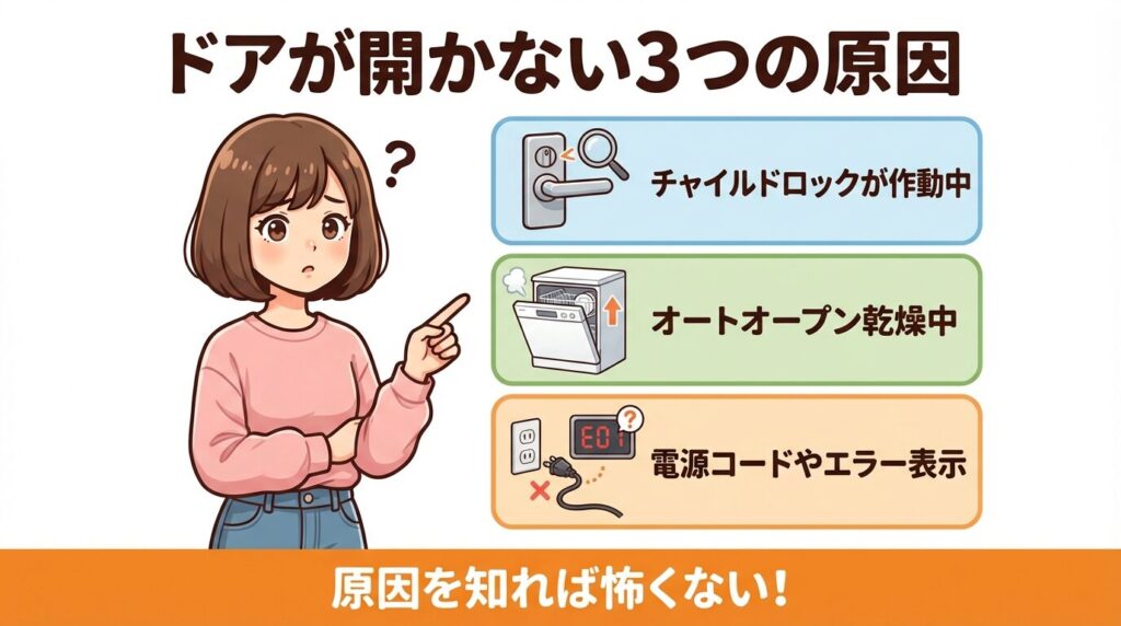 ミーレ食洗機のドアが開かない場合、原因は大きく分けて以下の3つに分類されます。まずはこのチェックリストを見て、ご自宅の状況がどれに当てはまるか確認してみてくださいね。