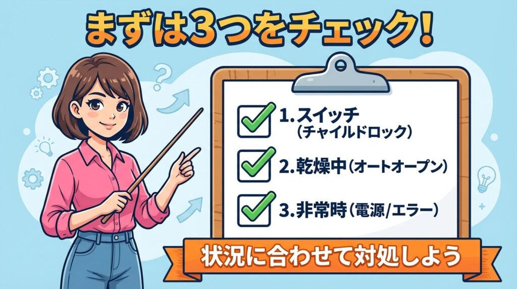 ドアハンドルの下にあるスライドスイッチが「ロック位置」になっている。小さなお子様がいるご家庭でよくあるケースです。 - ②オートオープン乾燥中(機能上のロック)
