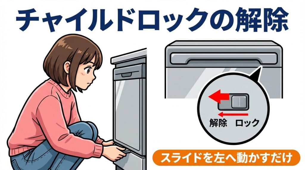 このチャイルドロックは物理的な機構なので、電源が入っていなくても操作できます。もしスライドが固い場合は、ドアを少し「押し込む」ように力を加えながらスライドを操作すると、ラッチの圧力が抜けてスムーズに動くことがありますよ。