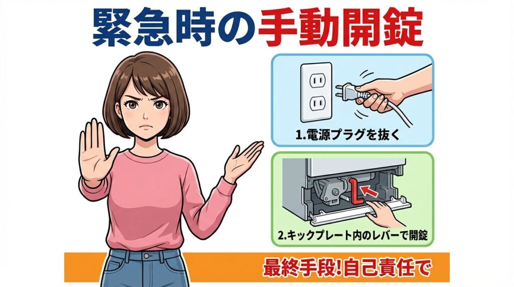 ただし、取扱説明書の「困ったときは」や「トラブルシューティング」のページに非常開錠の記載がない場合、その機種はユーザーによる非常開錠を推奨していません。無理にこじ開けようとすると、ドアラッチやヒンジを破損させ、修理費用が高額になる恐れがあります。