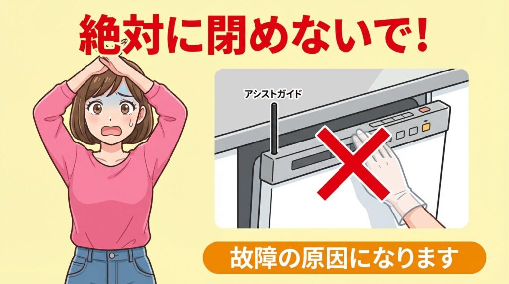 ここで一つ、絶対に守っていただきたい重要な注意点があります。それは、「アシストガイド(黒い棒)が出っ張っている状態では、絶対にドアを無理やり閉めない」ということです。