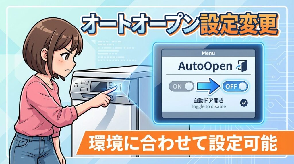 ただし、オートオープンは温風を使わずに余熱で乾燥させる「省エネ設計」の要となる機能です。OFFにすると乾燥性能が少し落ちたり、プラスチック容器の水切れが悪くなったりする可能性があることは知っておいてくださいね。