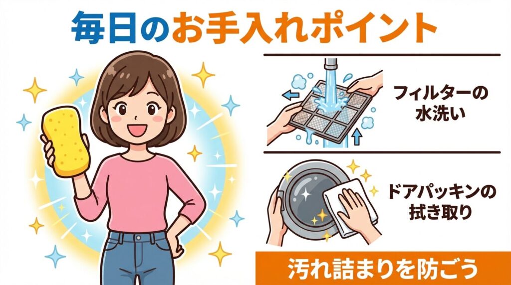 - フィルター掃除(週1回目安):庫内底面のフィルターを取り出し、食べカスなどを洗い流します。ここが詰まると排水エラー(F11)の原因になり、ドアロック解除に影響が出ることもあります。