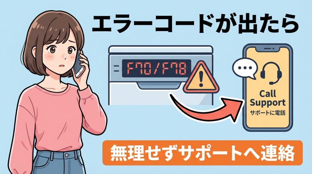 特に「F70」は水漏れのリスクがあるため、無理にドアを開けようとせず、まずは給水を止めることが先決です。